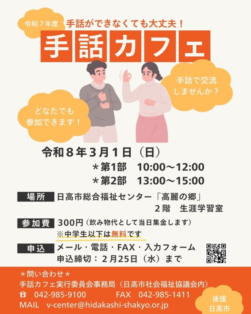 聞こえる人も聞こえない人も関係なく、手話で交流できる場です。一緒に楽しく手話を学びましょう。 日時 令和7年3月2日(日) 午前10時~午後3時 対象 どなたでも参加可能です。 費用 300円(飲み物代) 会場 日高市総 […]